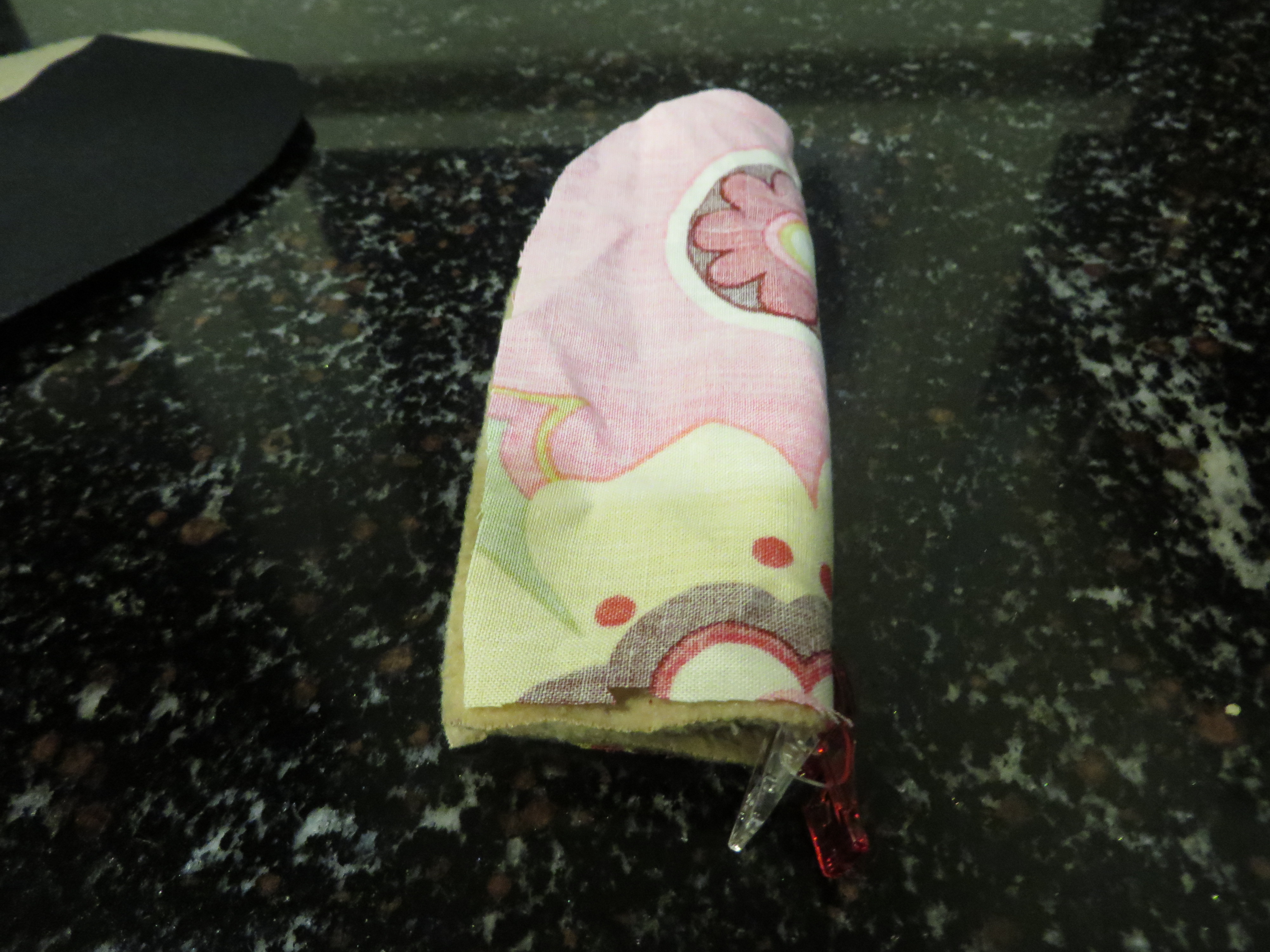 Place your ‘pretty sides’ together of your upper slipper piece, fold in half, and mark the half point. We’re looking like this now: