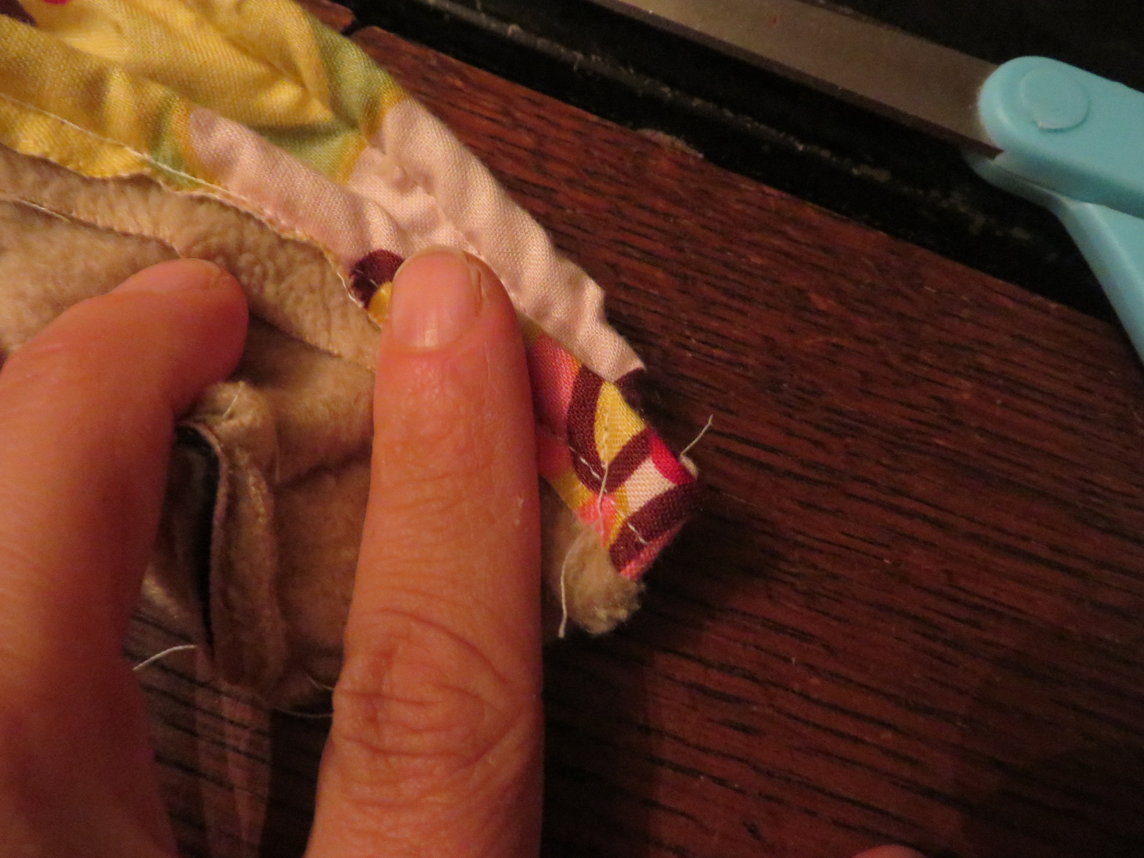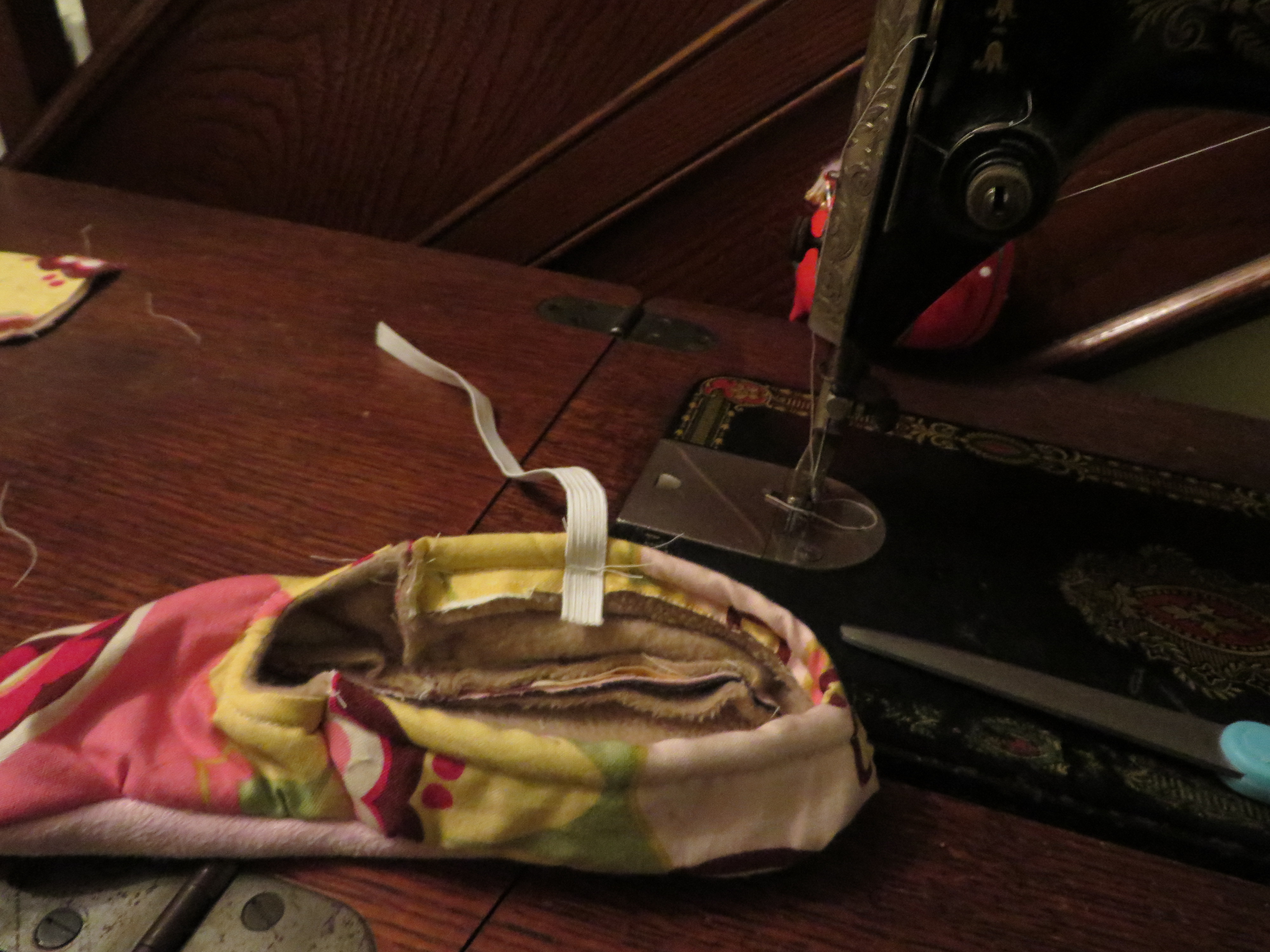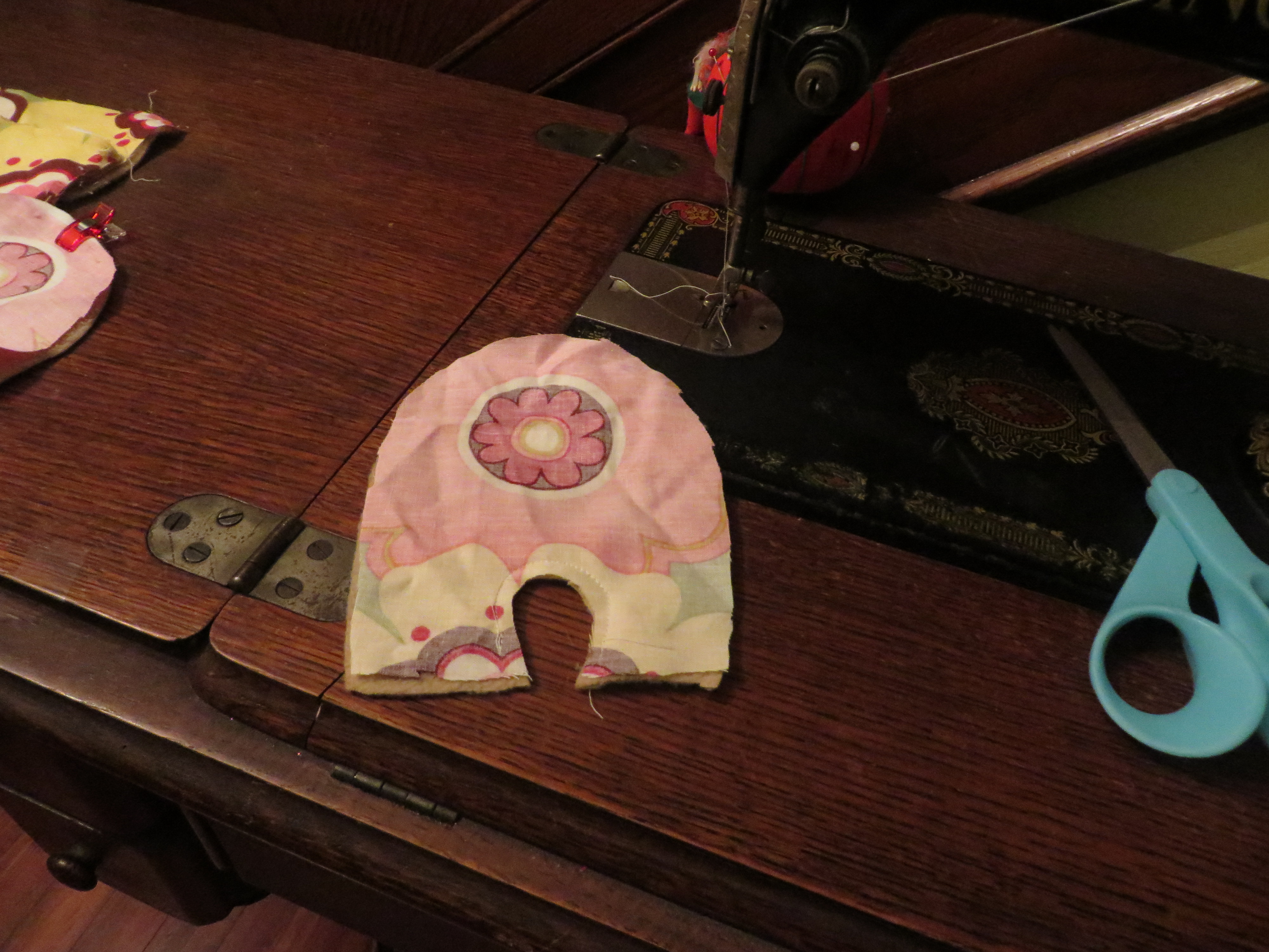Now we need to attach our heel band piece to our upper slipper piece. You’ll want to line up your hem lines, place fabric ‘pretty’ sides together, and sew.