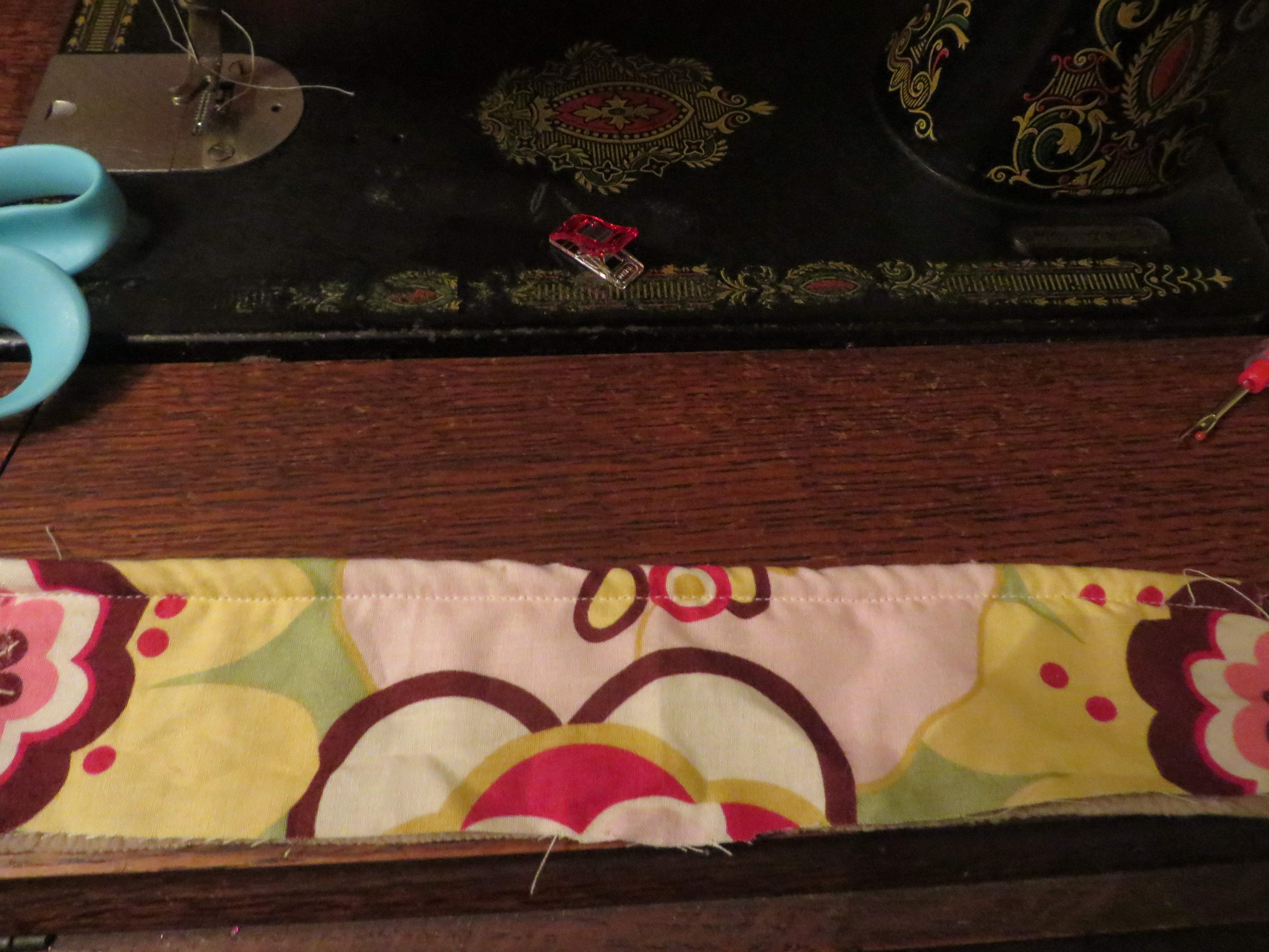 Next, turn your work right-side out (this is a pain in the butt for me!) and pin fabric straight. Topstitch it so that it looks pleasing to you.