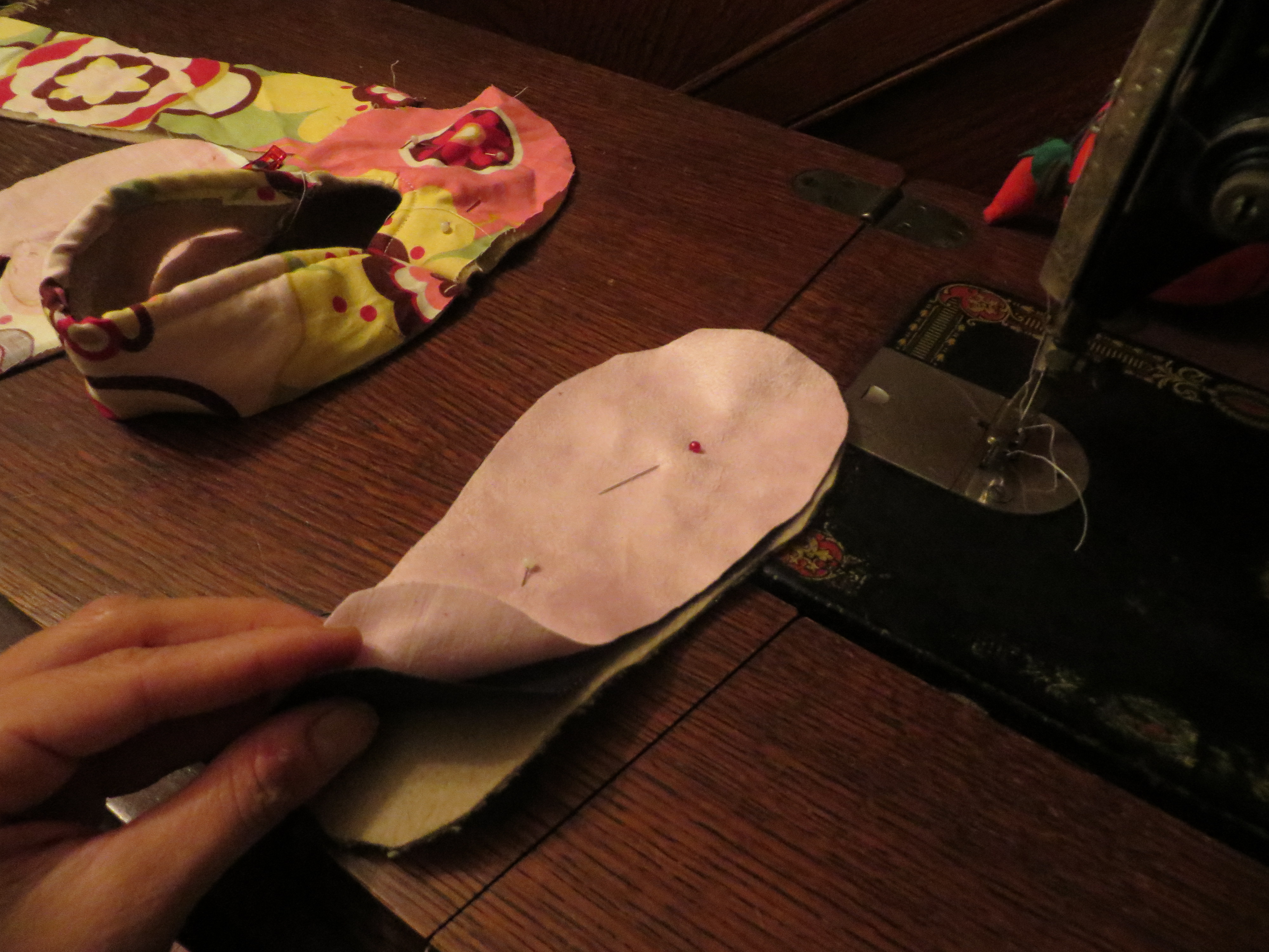 If you’re more precise than I am in making your pattern, this next part will be a breeze. I do things fast and sloppy sometimes, so this part is always a little wonky for me. Basically, you need to lay your top portion on top of the sole and pin very, very, very meticulously to your edges. I like to cheat, so i like to have a nice, big margin of error. So you will see in these next few pictures that I have a lot of extra fabric hanging over the edges. Maybe I’ll try to calculate it better next time, but probably not! :O)