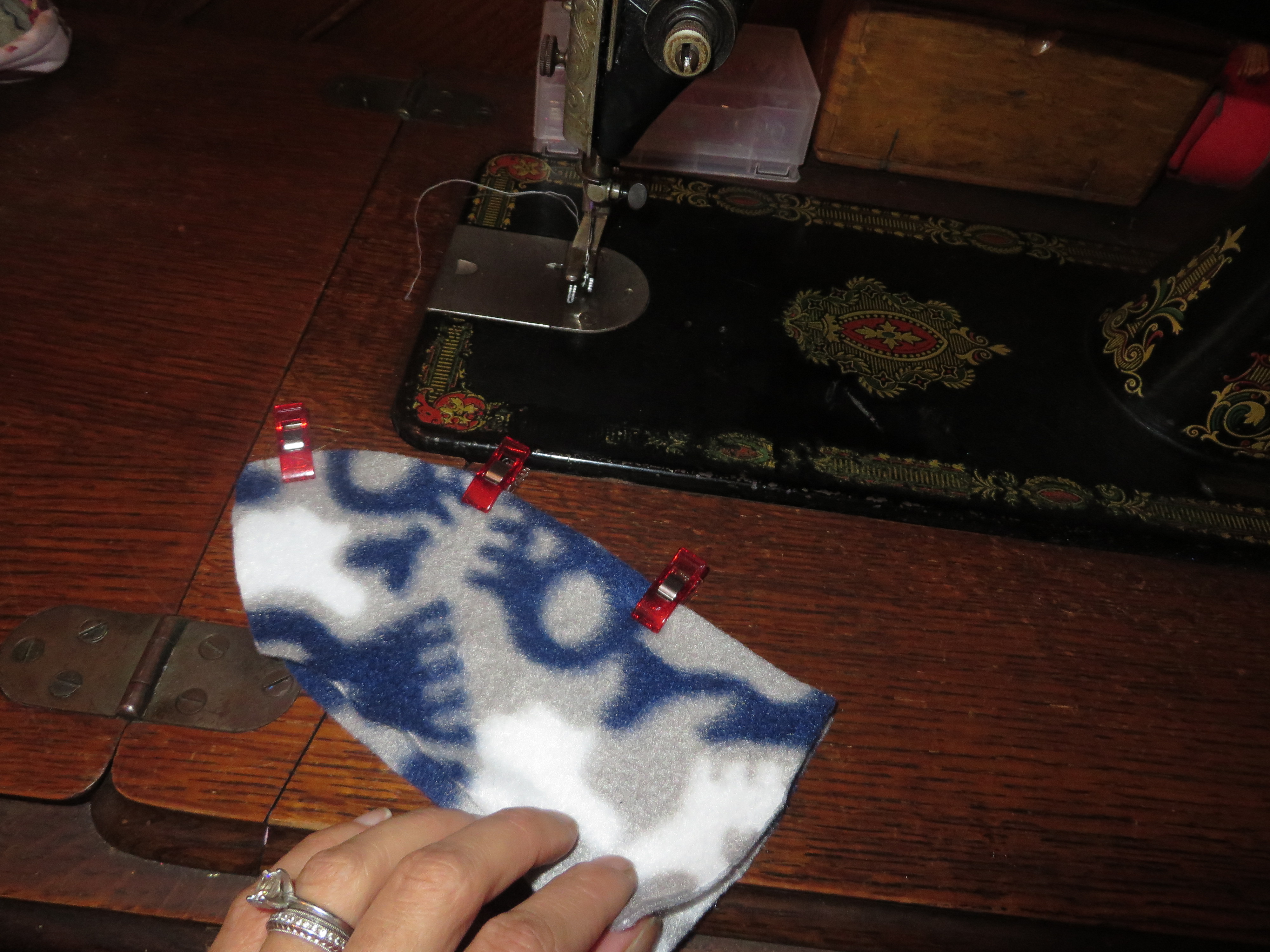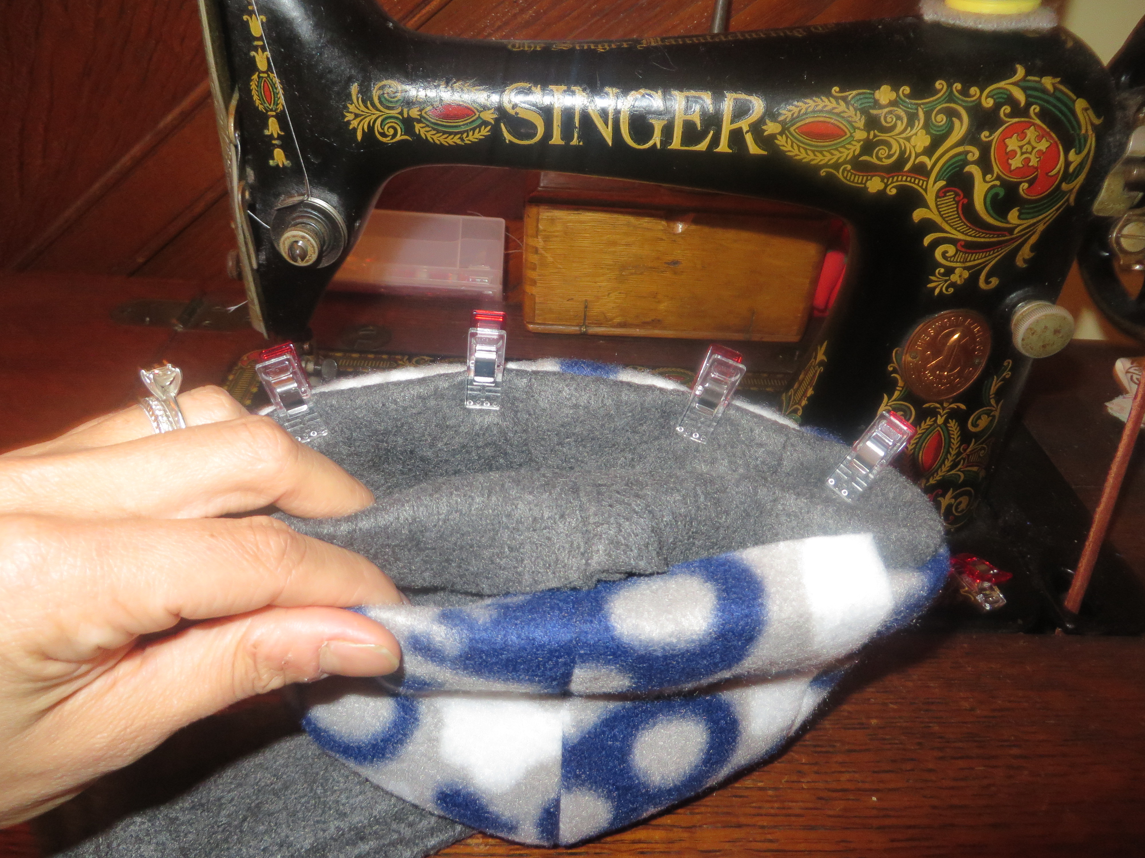 Sew and turn right-side out, making sure not to sew the long side, so you will be able to stuff that into your main hat, and, also, so that you have a turning hole. Again, do not sew on the portion where I do not have clips on the above picture. You need this side open!