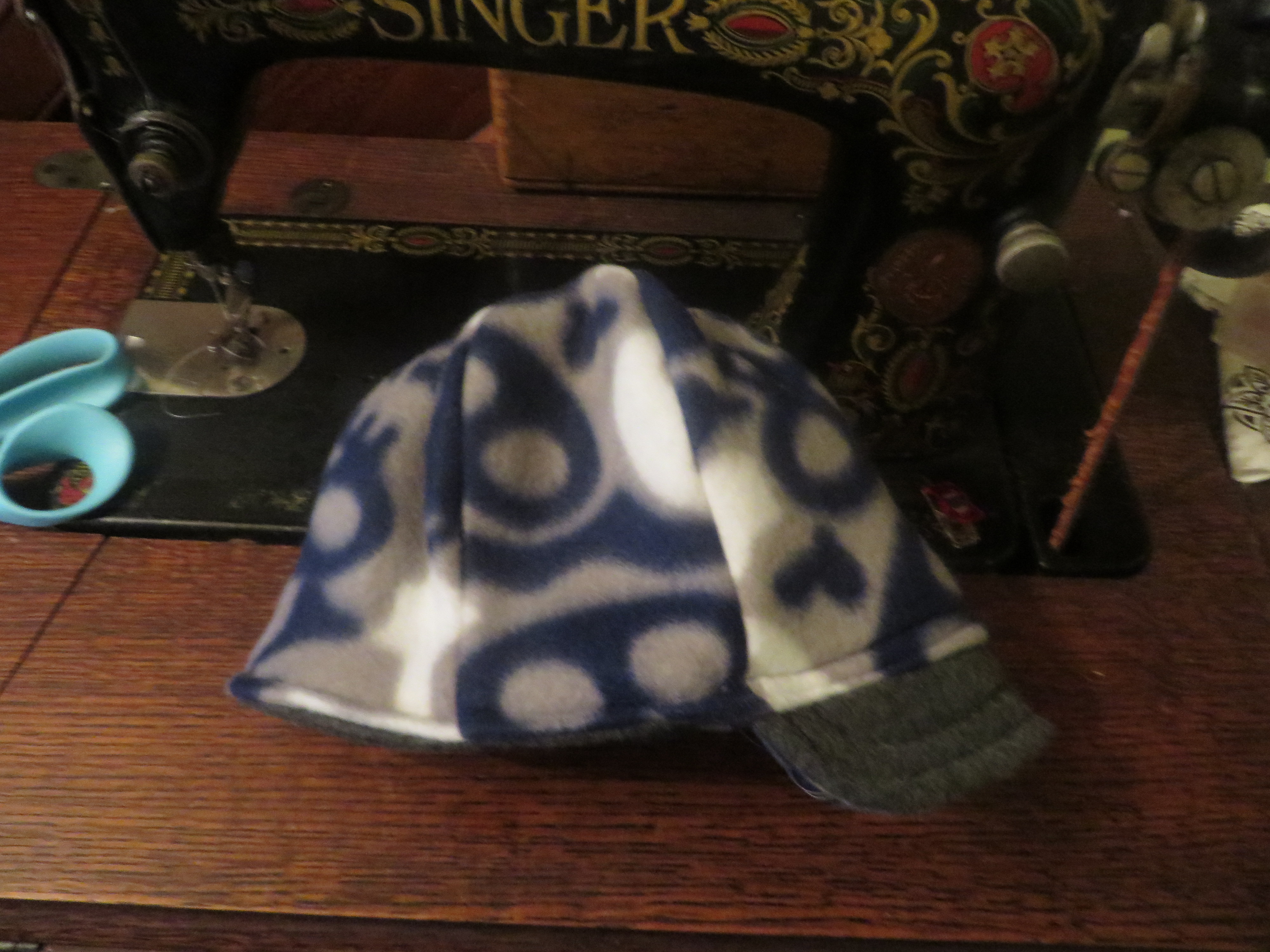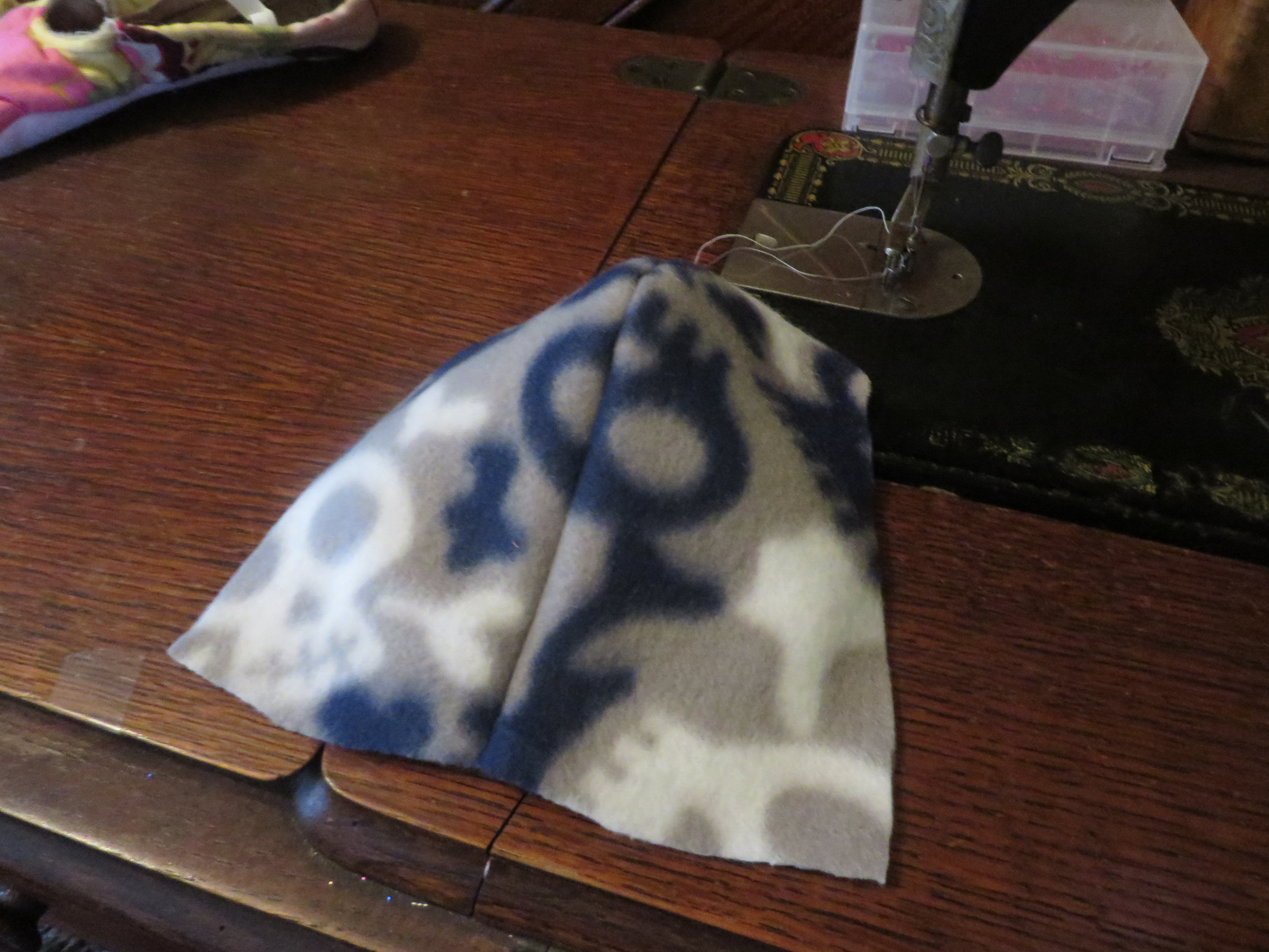 Now we have a three-panel hat, which we don’t want! So we have to fold what we have here in half, to make six panels.