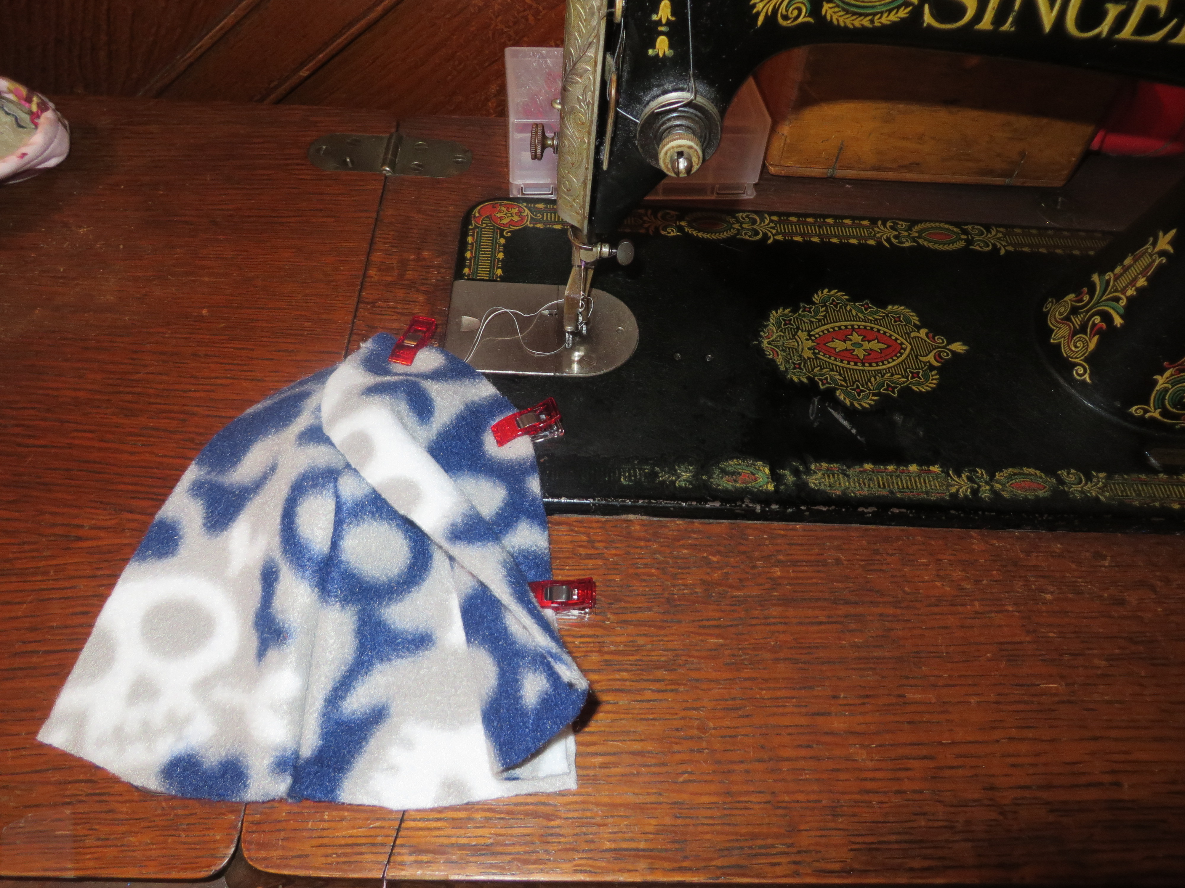 Clip a third hat panel piece onto one of the already-sewn hat panels, right sides together.