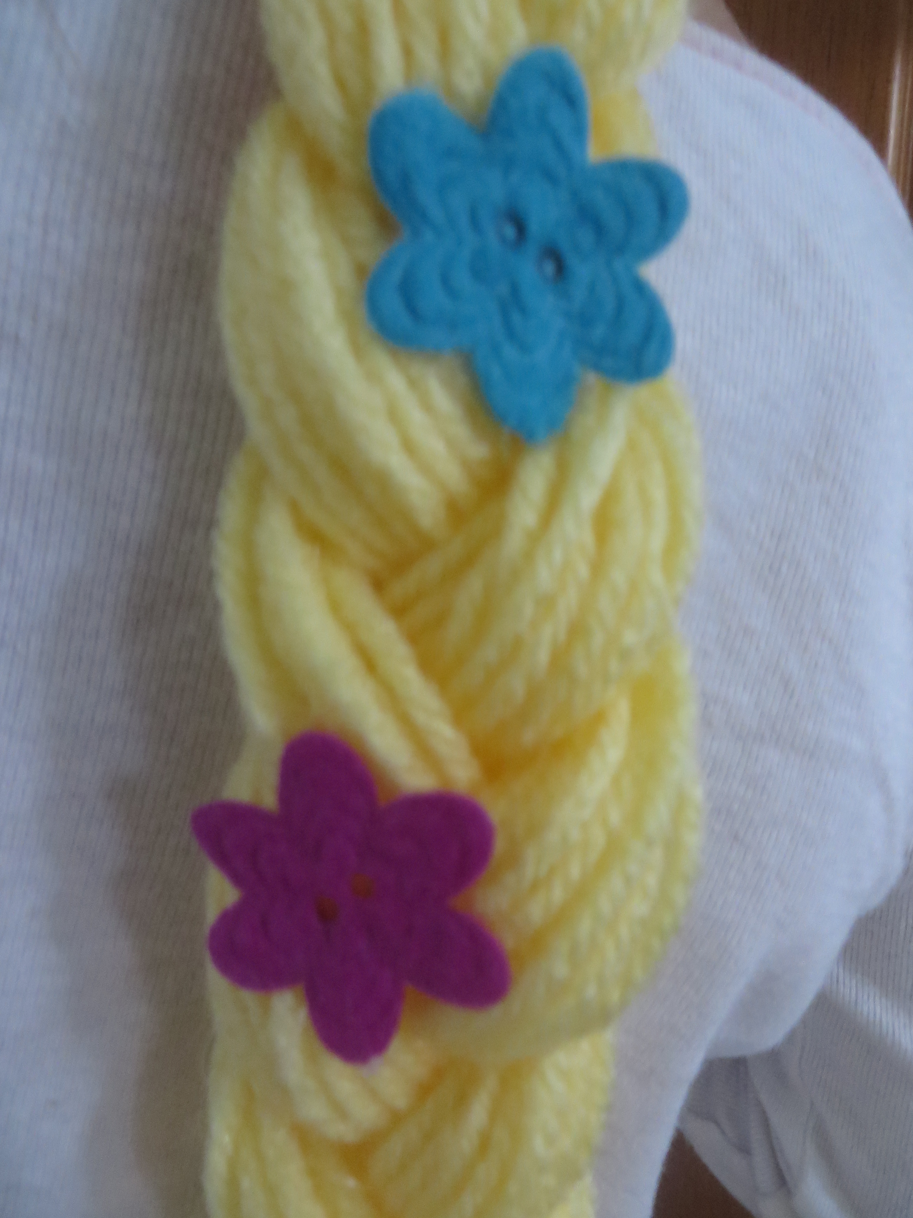Now, it’s time for your glue gun and embellishments. This happens to be my favorite part. I have used silk flowers, plastic button flowers, and felt flowers for this. The fabric flowers can be hand-sewn, but the glue gun is quicker. And I always have two little impatient customers looking over my shoulder when I’m making Rapunzel braids, so speed is of the essence!