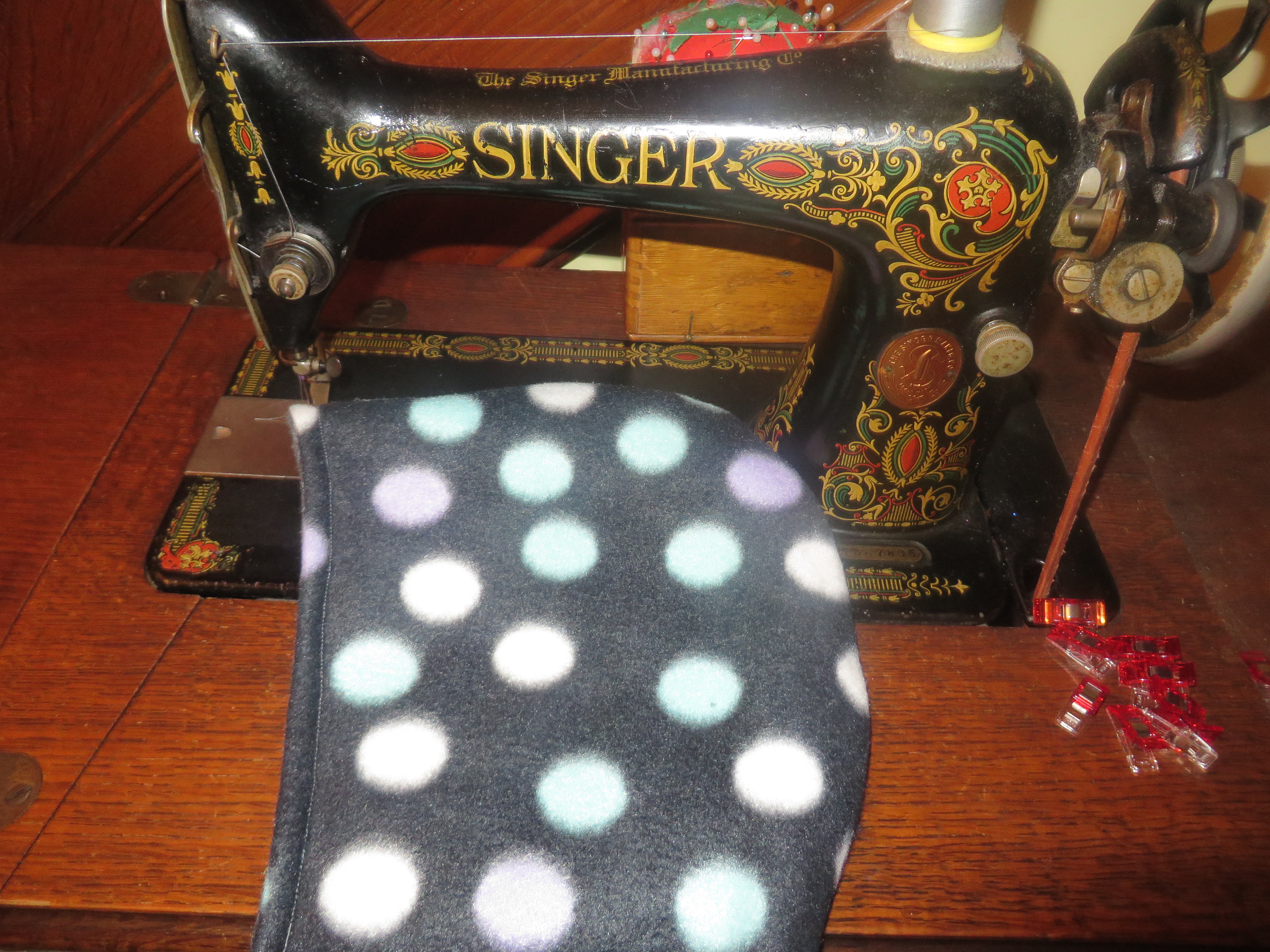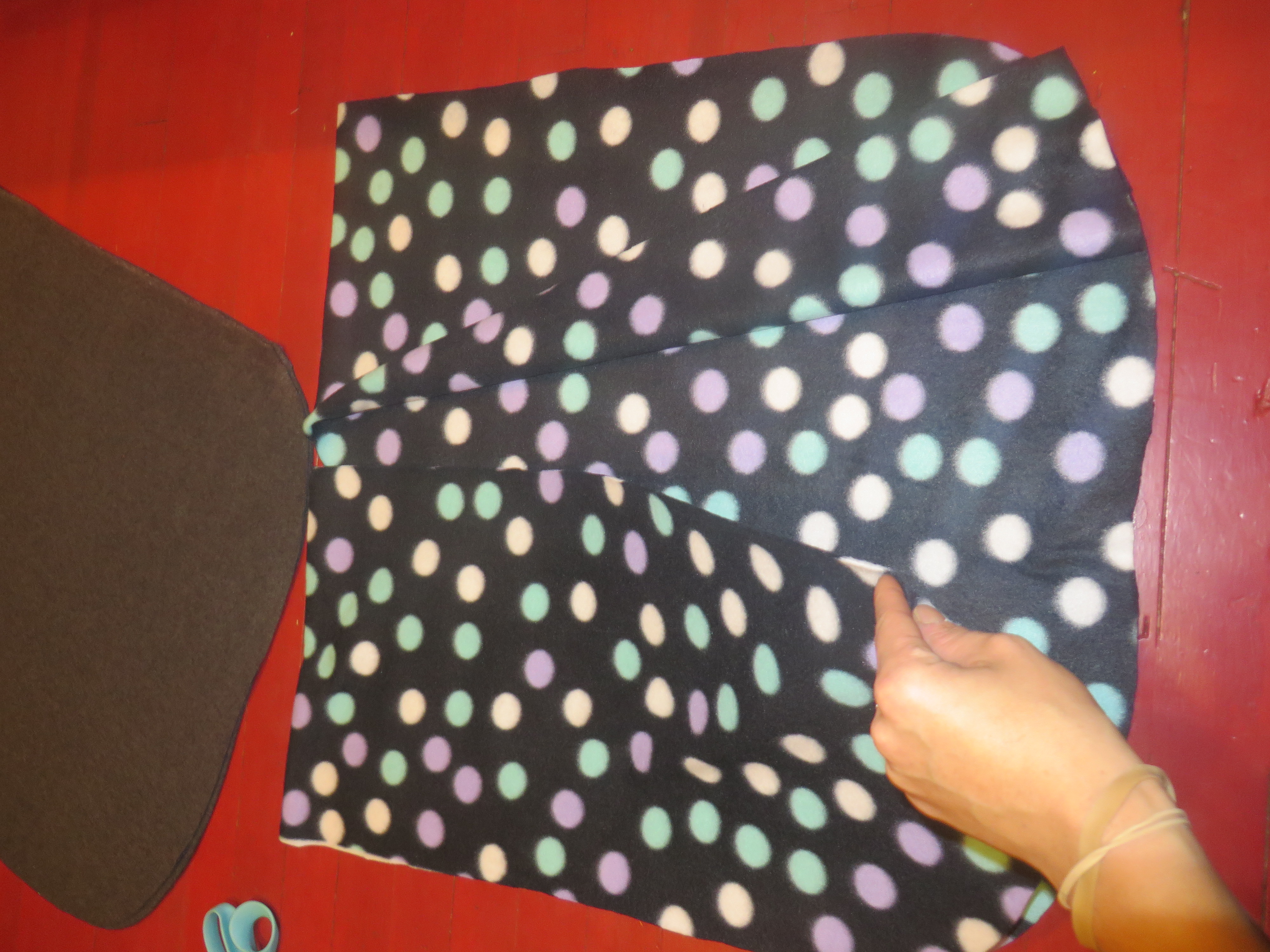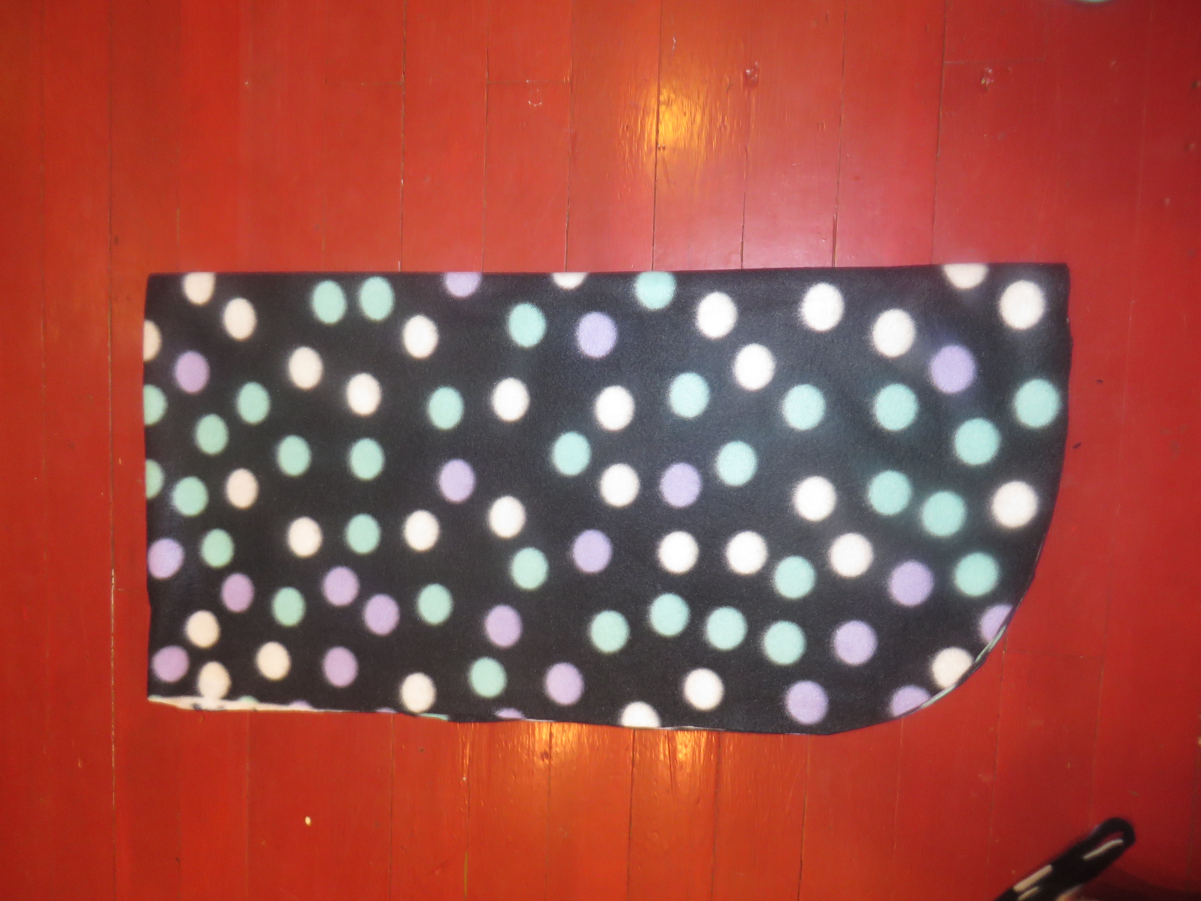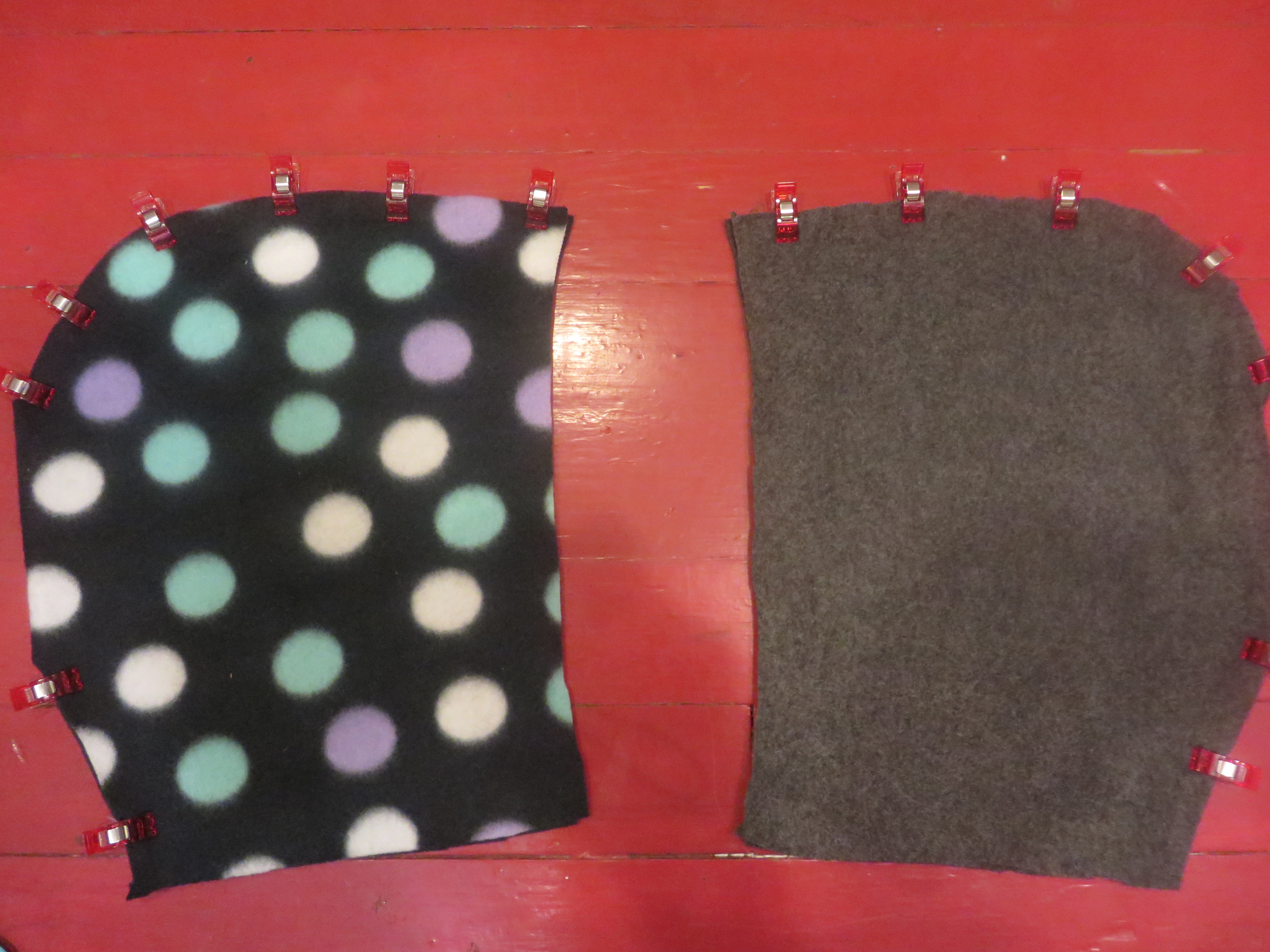 1.5 yards each of a solid and a polka dot patterned fleece fabric (I had extra, which I like for making matching hats, scarves, mittens, etc.)