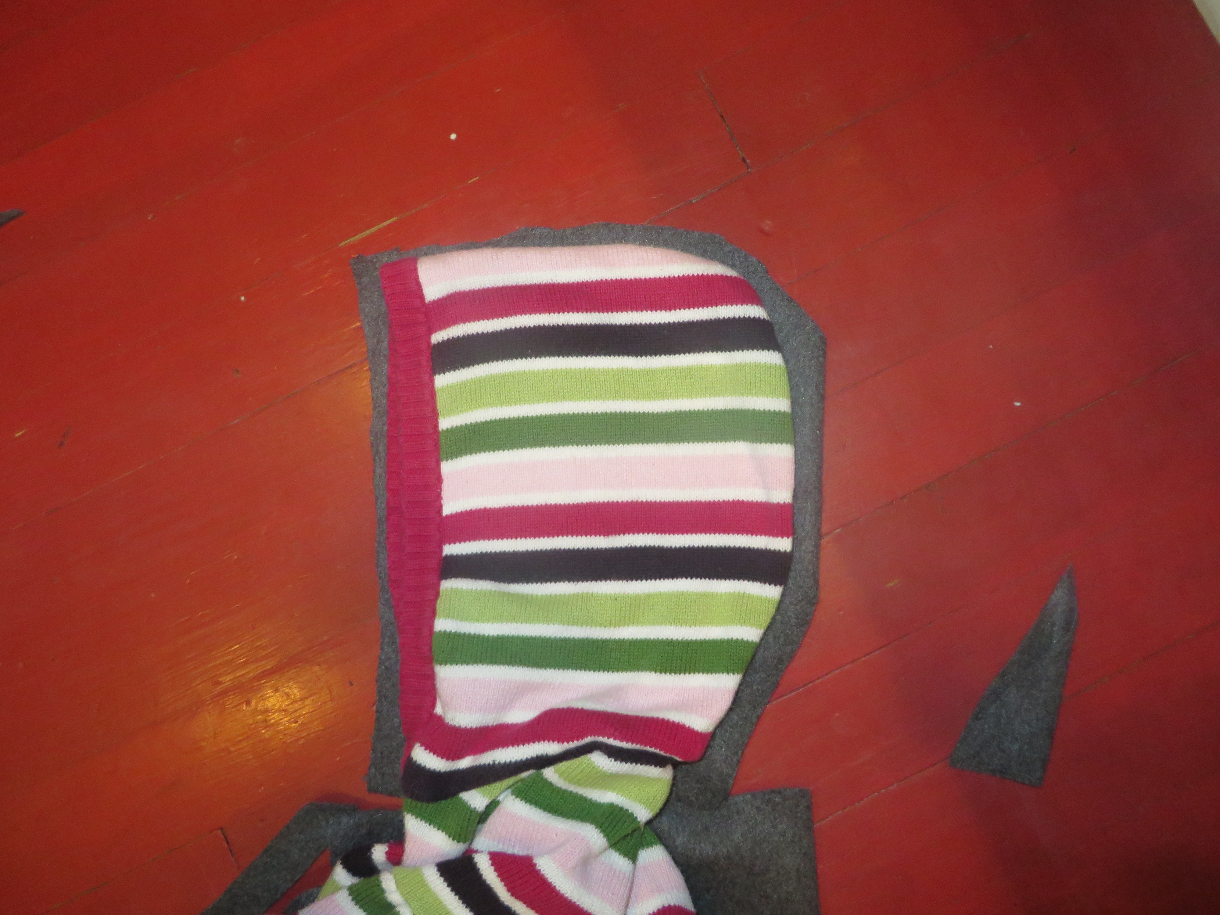 Let’s set this aside and make the hood. For some reason, this seems to be my habit — to get the main piece cut and then go make the hood. Don’t ask why! I have no answers! I am really picky with hoods, so if I have a piece of clothing that has a hood that I really like, I will copy that. I like big, full hoods that do a good job of covering my ears. A.S. has this great sweater with a nice, full-bodied hood. I cheat with it often! :O)