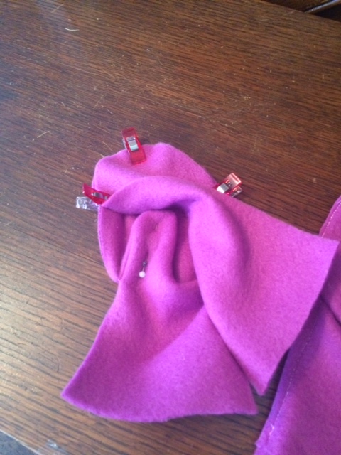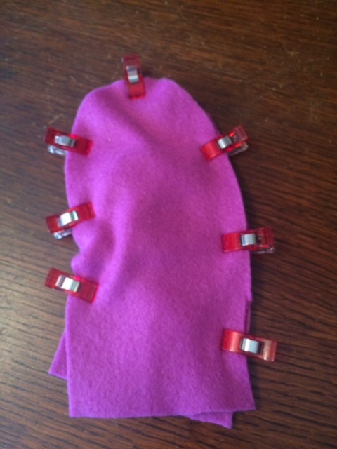 At this point, we need to sew this up to our main mitten piece. But we don’t want that pesky thumb to get in the way. Pin it way into the middle so there’s no risk of it sneaking into your sewing space.