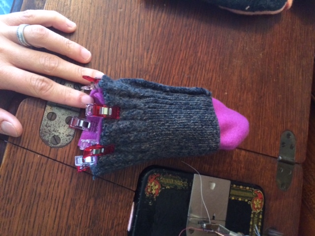 Set aside your outer wool layer for a minute and grab one of your fleece inner mittens. Also grab one of your sweater cuffs.