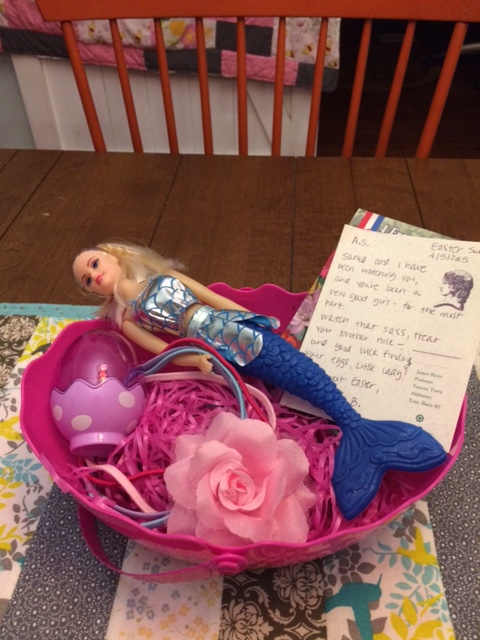 And before I go to bed myself, I want to share some pics of the kids’ baskets. They were great finds at the local Dollar Tree, and A.S.’s can be used as a little baby doll carrier when she’s done with it. She will love that. She’s also got some headbands and a mermaid imitation Barbie that she’ll get a kick out of.