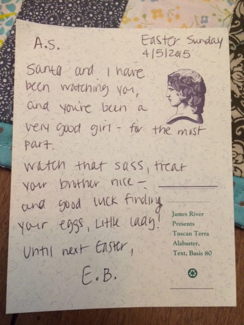 Of course, Santa told E.B. that he gets cookies to munch on when he drops off his gifts. E.B. decided, at least at our house, that he wanted to play a game with us. He leaves us a basket and a note for the littles. After that, he goes in our fridge and scopes out how we designed our eggs. He is a little stinker, and he makes off with our eggs, only to hide them in silly places outside in the yard and garden. A.S. and A.W. love to find out what crazy places E.B. put their eggs for them to find on Easter morning!