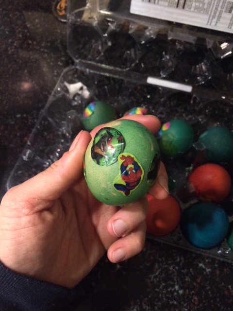 And speaking of egg decorating, this year we did the vinegar and food coloring dye. In the past, we have just done stickers to make it easy for little hands. From now on, we will do it this way. The kids had a blast with this!