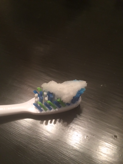 Step 4. Plop on your dry toothbrush (you don’t want to rinse your brush first and get extra moisture in with your toothpaste) and brush with gentle pressure. (Baking soda is abrasive, so a little goes a long way. You will find you don’t need to press very hard at all to get the cleaning action you desire!)